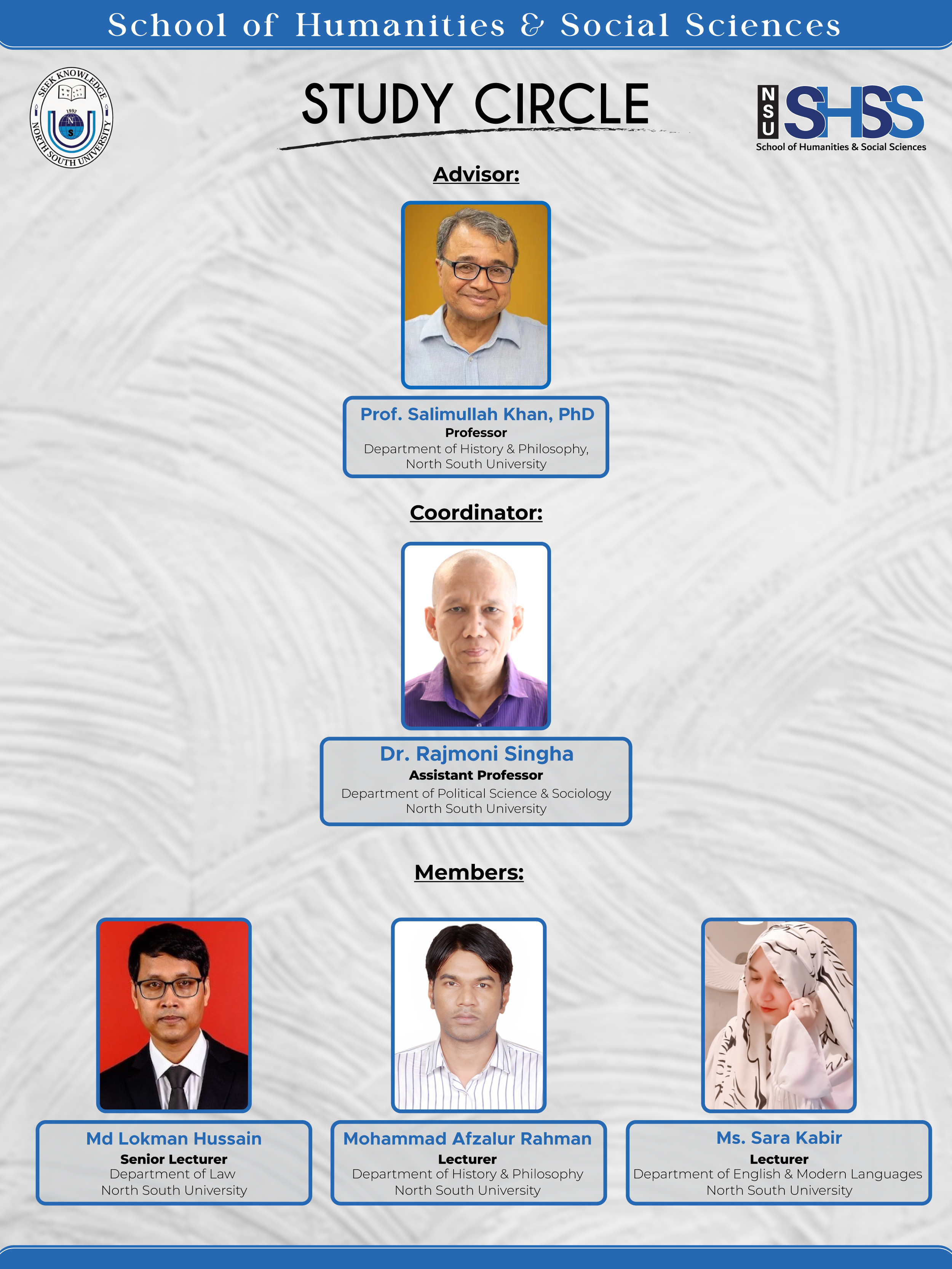The School of Humanities and Social Sciences (SHSS) strives to work in furtherance of the overall mission and vision of North South University. At SHSS, we want to impart a well-rounded, high-quality education to all our students, enshrining the liberal arts ethos of North South University. It has been a cliché that a student lives in an ever-changing world in which they need to think laterally and solve new challenges. To ensure that our students are able to attain these goals, SHSS teaches a diverse range of units as part of all the undergraduate courses of North South University, focusing on the individual, the society, and the globe, such as understanding the human person, society, institutions, law, policy, ethics, and governance. Our research-active faculty members strive to imbue a culture of cutting-edge, research-informed teaching. Our academic departments actively engage in organizing various academic dialogues and programmes with a diverse range of stakeholders. On behalf of my colleagues, I welcome you to our vibrant SHSS.