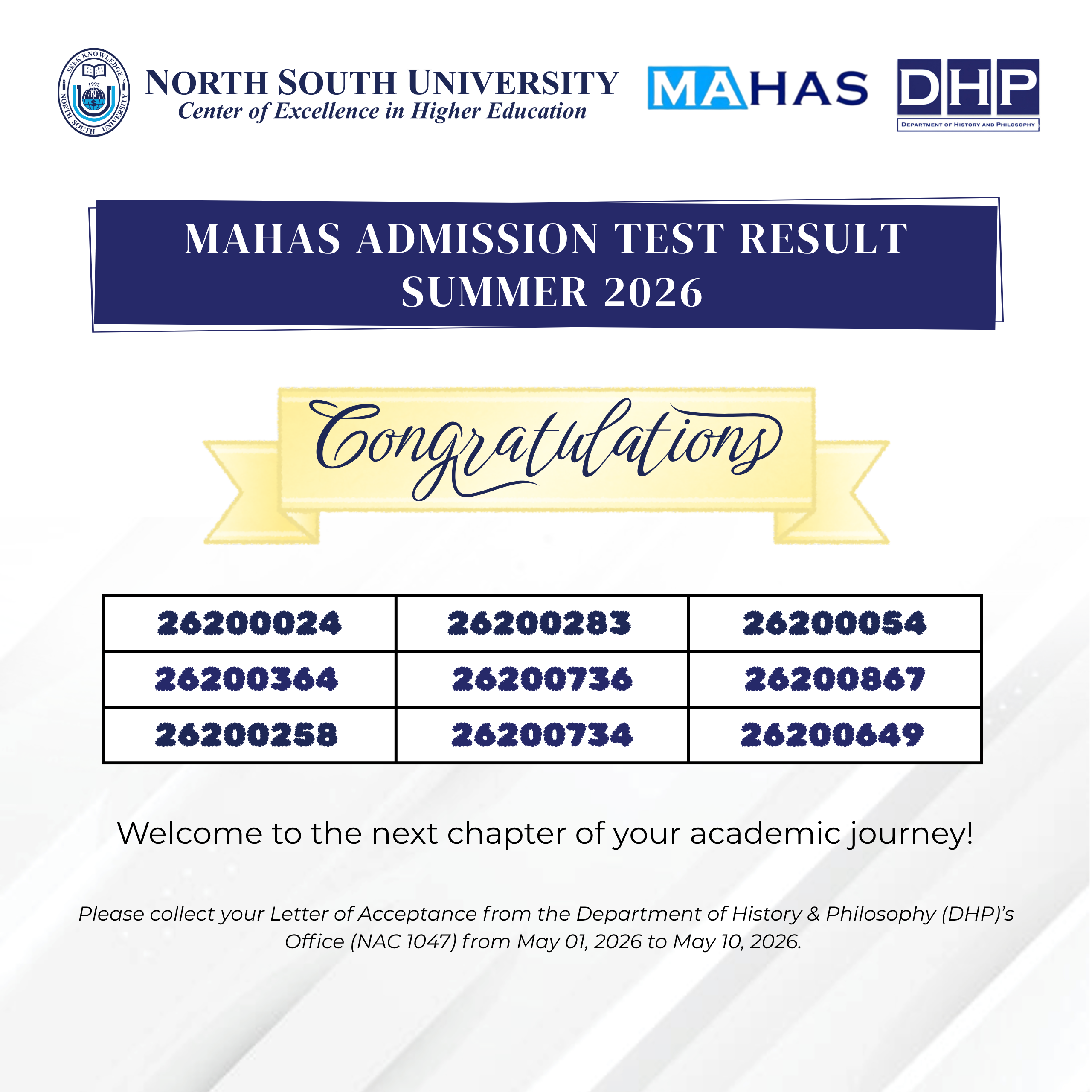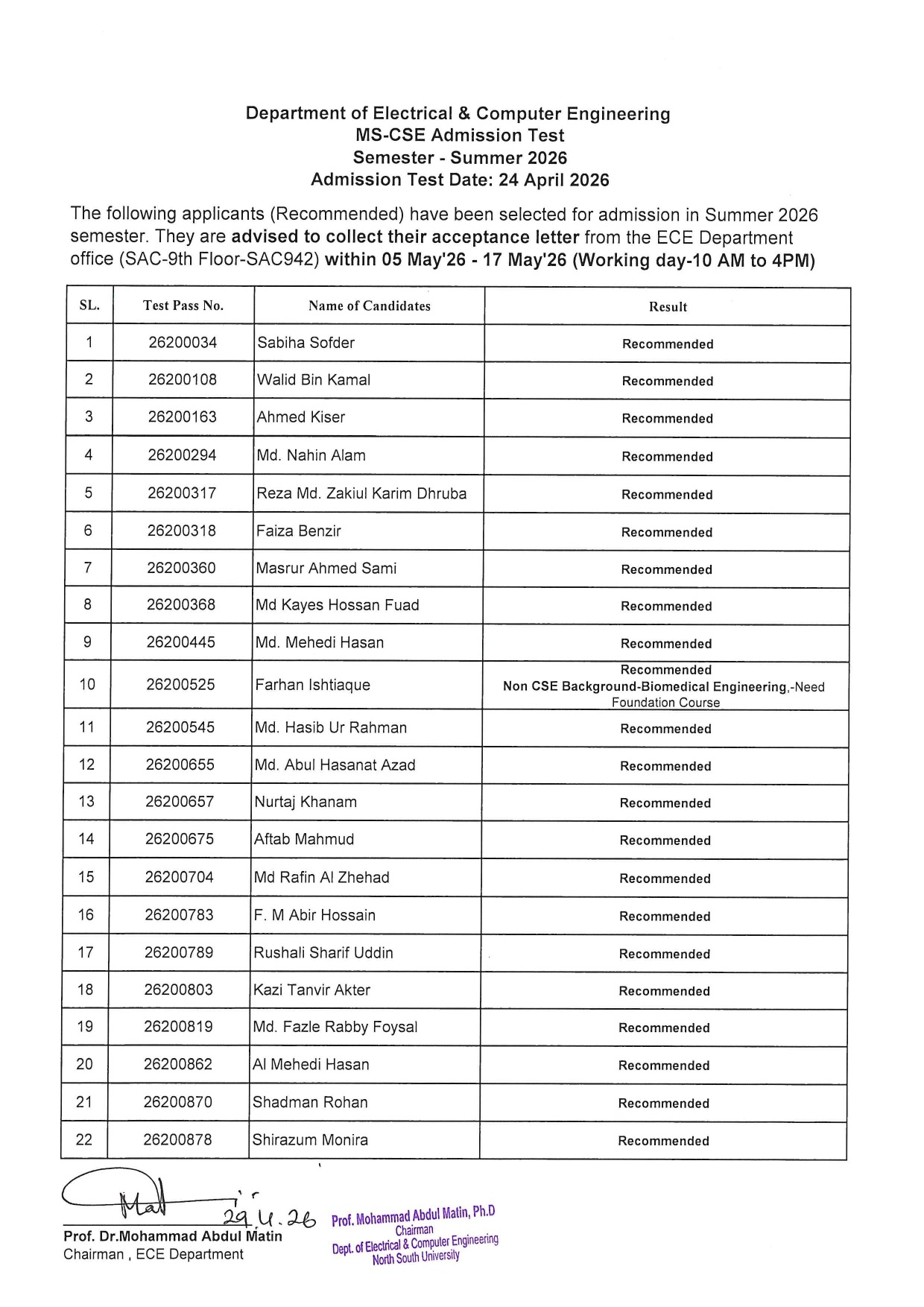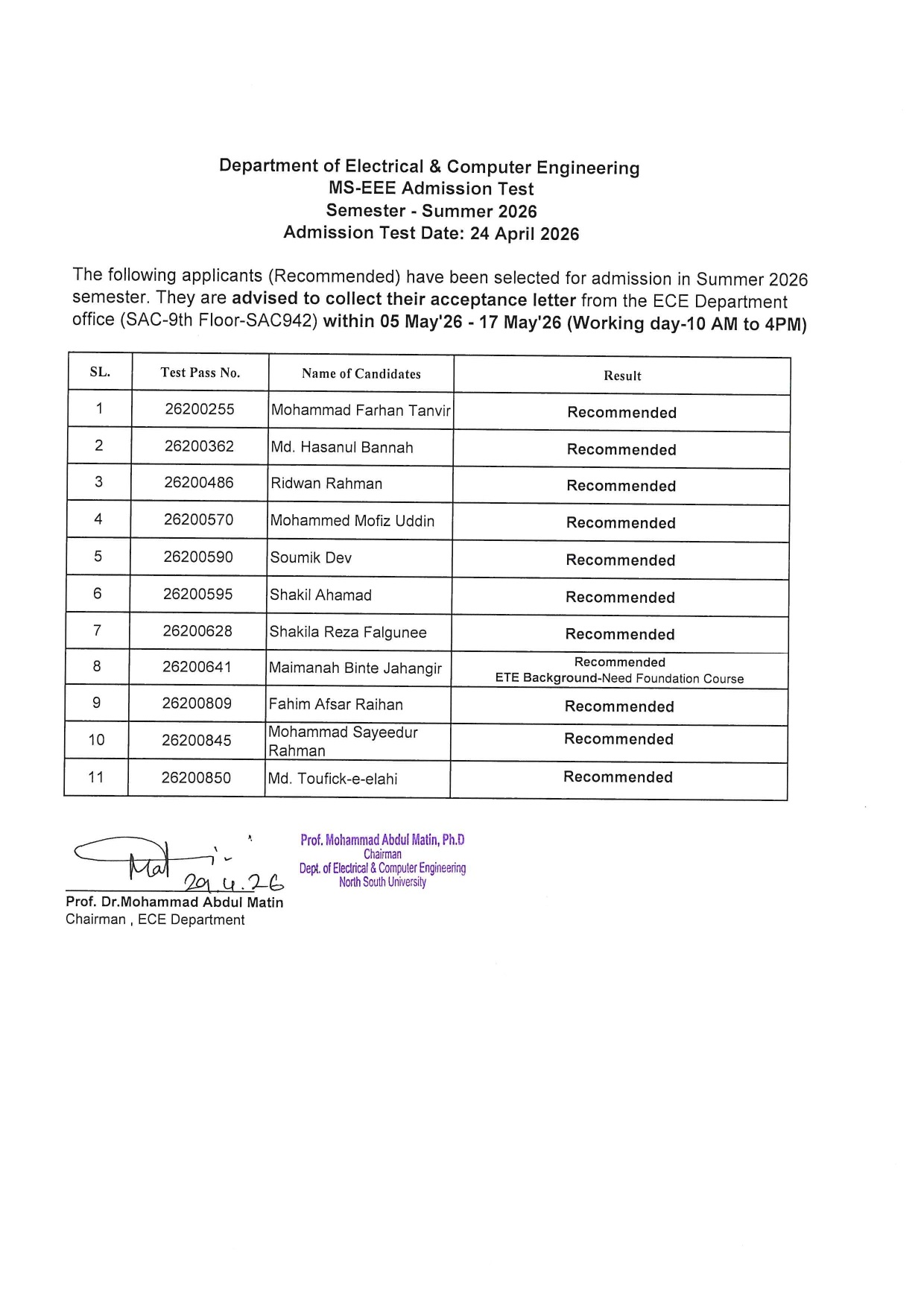 Graduate Admission Test Result - Summer 2026