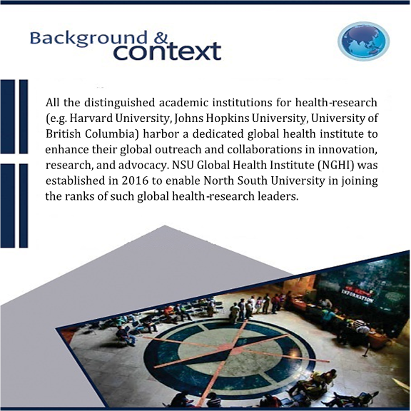 All the distinguished academic institutions for health research (e.g. Harvard University, Johns Hopkins University, University of British Columbia) harbor a dedicated global health institute to enhance their global outreach and collaborations in innovation, research and advocacy. NSU Global Health Institute (NGHI) was established in 2016 to enable North South University to join the ranks of such global health-research leaders.